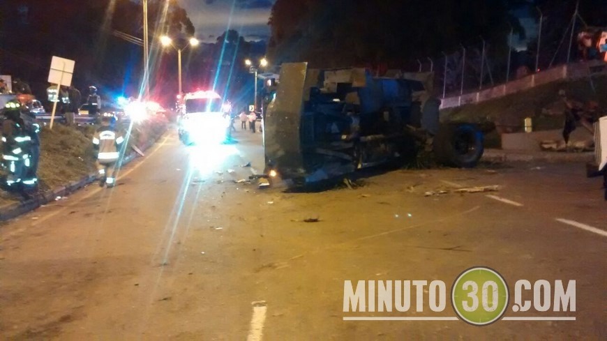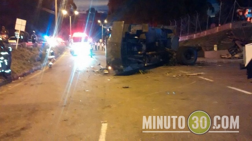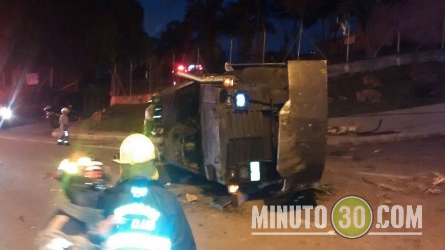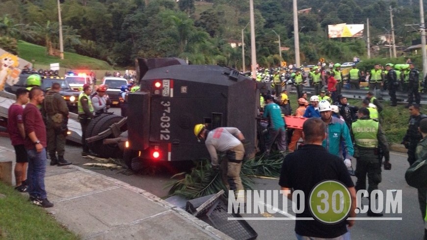 Minuto30.com – En las últimas horas una tanqueta del Escuadrón Móvil Antidisturbios, ESMAD, que se movilizaba por la Vía Las Palmas, a la altura de La Colegiatura, sufrió un volcamiento sobre la vía.