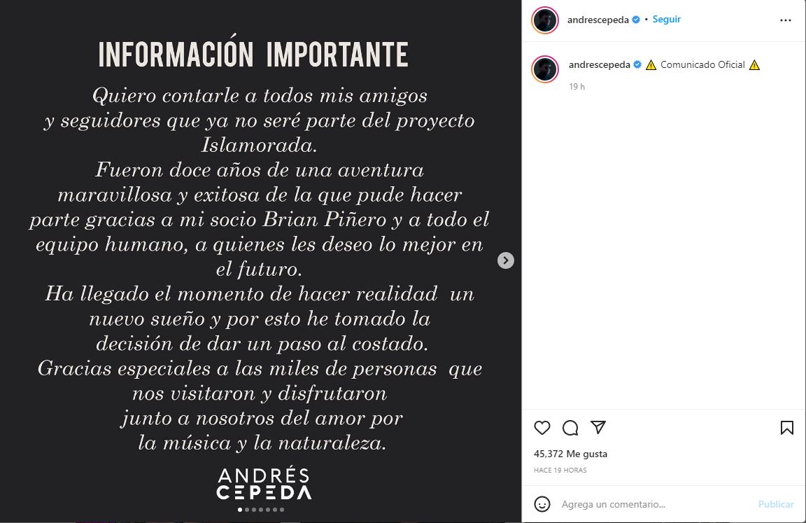 “Quiero contarle a todos mis amigos y seguidores que ya no seré parte del proyecto Islamorada. Fueron doce años de una aventura maravillosa y exitosa de la que pude hacer parte gracias a mi socio Brian Piñero y a todo el equipo humano, a quienes les deseo lo mejor en el futuro”, escribió Cepeda a través de un comunicado publicado en sus redes sociales.
