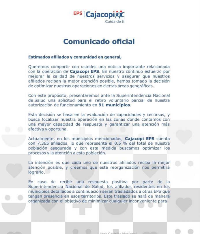 Según un comunicado oficial emitido por Cajacopi EPS, esta solicitud ante la Superintendencia de Salud tiene como objetivo concentrar recursos y esfuerzos en áreas geográficas más estratégicas, manteniendo el compromiso de garantizar la continuidad en la prestación de servicios de salud para sus usuarios.