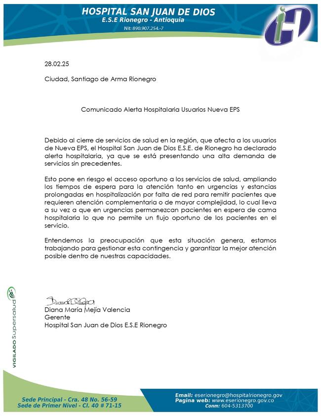 Resumen: El Hospital San Juan de Dios de Rionegro declara alerta hospitalaria por la alta demanda de servicios debido al cierre de hospitales en Oriente de Antioquia, afectando principalmente a los afiliados a la Nueva EPS.