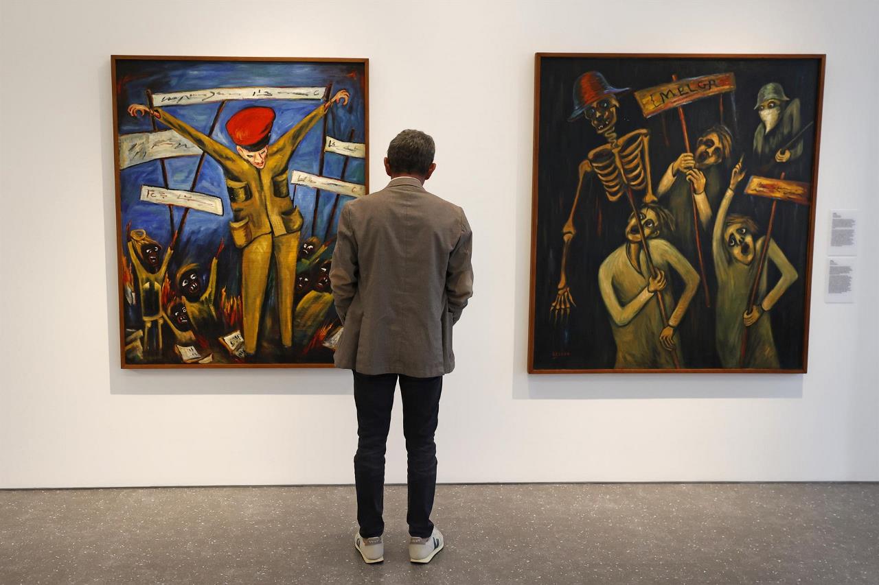 Asistentes a la exposición de la pintora colombiana Débora Arango observan las obras “Huelga de Estudiantes” y “Melgar” hoy, en la Sala de Arte de la sede de Bancolombia, en Bogotá (Colombia). EFE/Mauricio Dueñas Castañeda