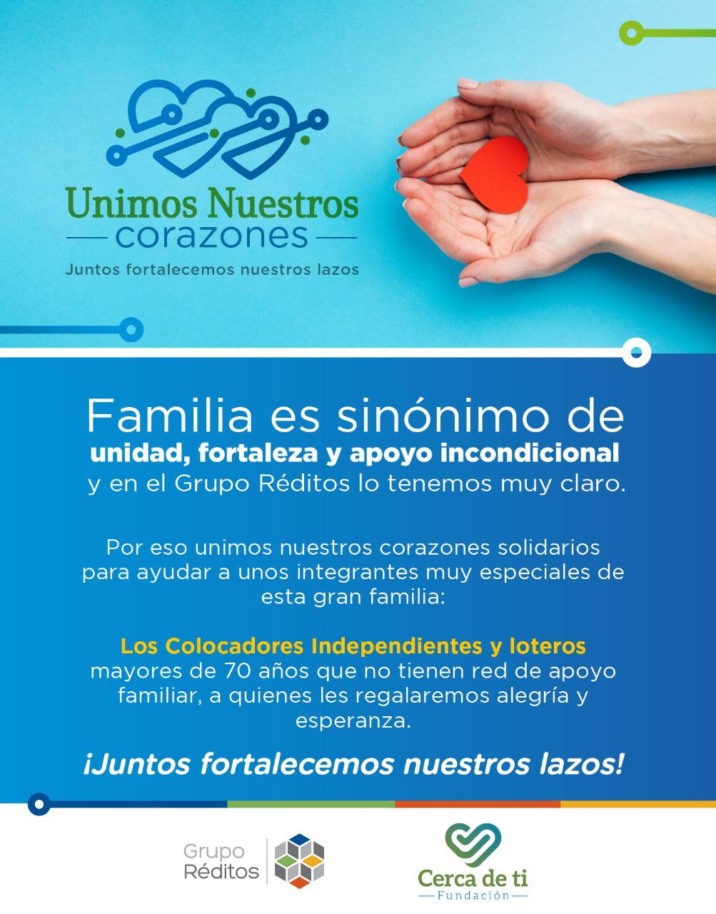 “Nuestros Corazones se Unieron para que colocadores independientes de la Red Gana y Loteros de Loticolombia mayores de 70 años, jefes de hogar, sin red de apoyo familiar activa y sin otros ingresos fijos mensuales adicionales a su comisión, tengan un recurso económico que les permita afrontar esta situación”. Afirma, Andrés Felipe Cano Pineda, director ejecutivo de la Fundación Cerca de ti.