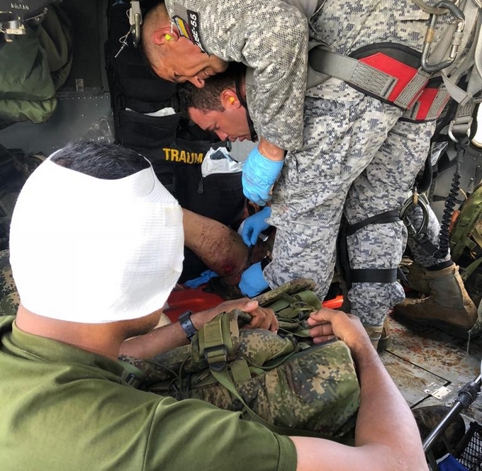Durante el vuelo, pararrescatistas del Comando Aéreo de Combate No.5, brindaron atención primaria y estabilizaron a los pacientes para garantizar entregarlos con vida a los especialistas que los aguardaban en la capital antioqueña para prestarles atención inmediata.