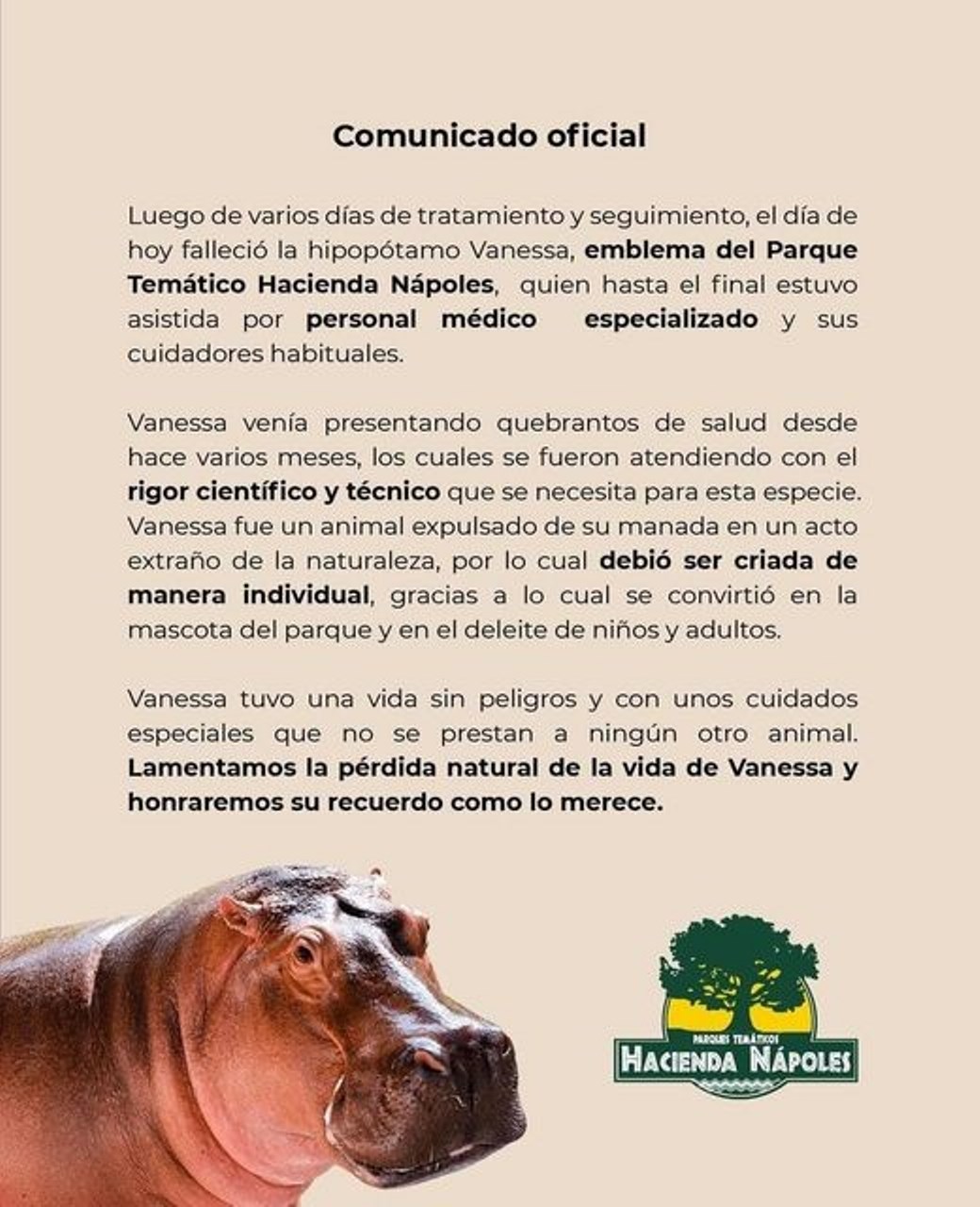 Minuto30.com .- El Parque Temático Hacienda Nápoles informa, a través de las redes socailes, de la muerte de la hipopótamo Vanessa, quien fue rechazada por su manada y criada en un santuario animal del parque.