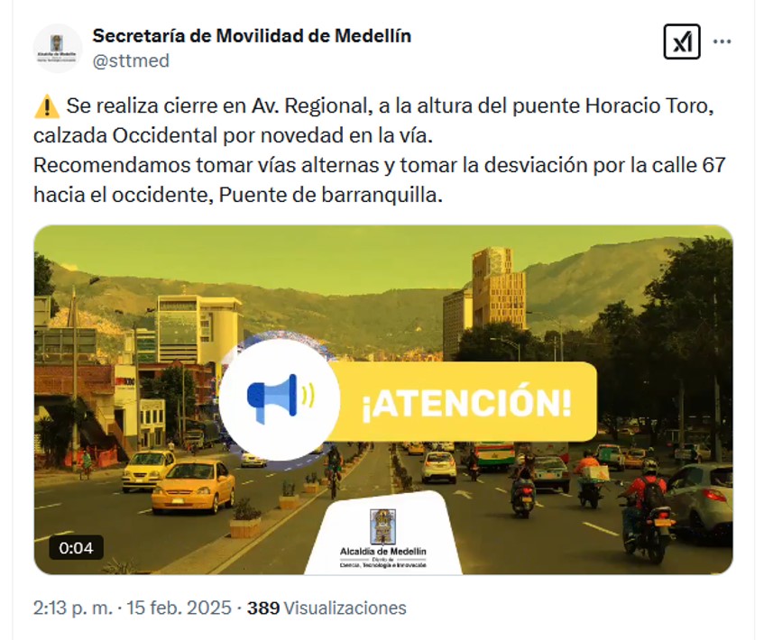 Minuto30.com .- La Secretaría de Movilidad de Medellín informa que, desde las 2:13 de la tarde de este sábado 15 de febrero, se está llevando a cabo un cierre en la Avenida Regional, a la altura del puente Horacio Toro, sobre la calzada Occidental.