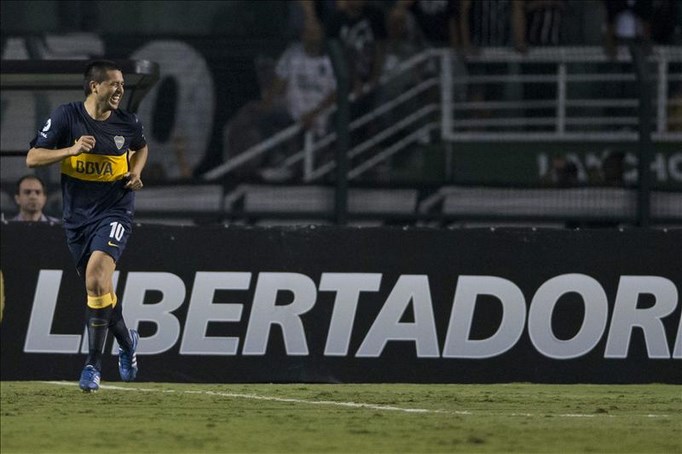 El jugador de Boca Juniors Juan Riquelme celebra una anotación ante Corinthians durante el partido de octavos de final de la Copa Libertadores en el estadio de Pacaembu en la ciudad de Sao Paulo (Brasil). EFE