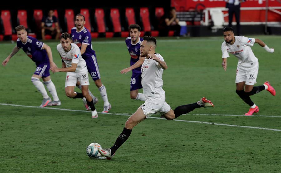 Le costó al Sevilla en el arranque imponer su ritmo y ejercer de local ante las vacías gradas del Sánchez Pizjuán, incluso fue el Valladolid el que, con su presión, se acercó más hacía el área rival, aunque fue una jugada por la derecha de Jesús Navas al borde del cuarto de hora con remate final del argentino Lucas Ocampos lo que motivó la primera acción clara para marcar.