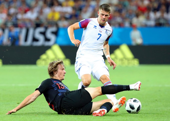 • Johann Gudmundsson (up) of Iceland in action against Tin Jedvaj (bottom) of Croatia