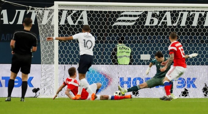 Al final de la primera parte el árbitro se apiadó de los locales al no pitar lo que pareció un claro penalti de la defensa rusa a Martial.