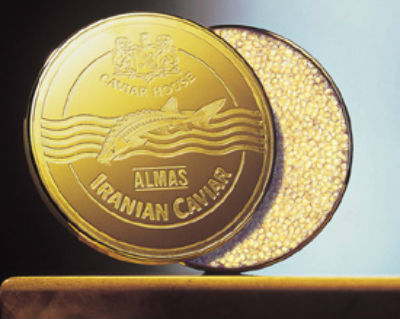 Caviar Almas. Proviene de un esturión beluga albino del mar Caspio, de la zona de Irán. El color de las huevas es claro y viene empacado en una caja de oro de 24 quilates. Tiene un costo de 25 mil dólares.