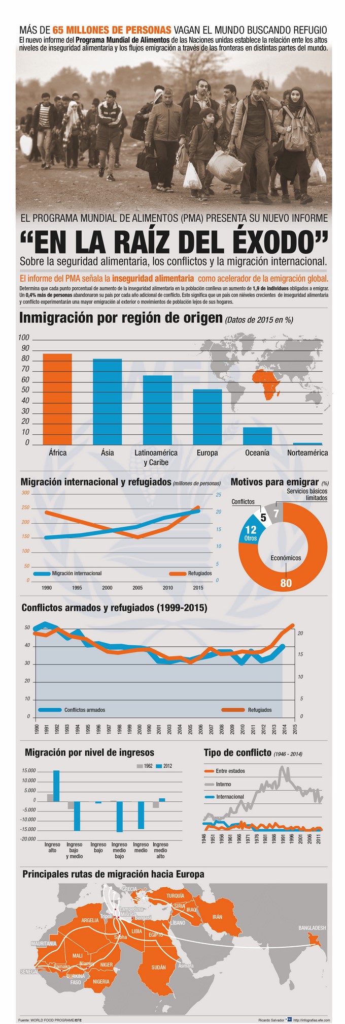 La inseguridad alimentaria, que 108 millones de personas en el mundo sufren de manera aguda, incita a la emigración, y cada 1 por ciento adicional de personas sin acceso a comida hace que un 1,9 por ciento más opte por la migración.