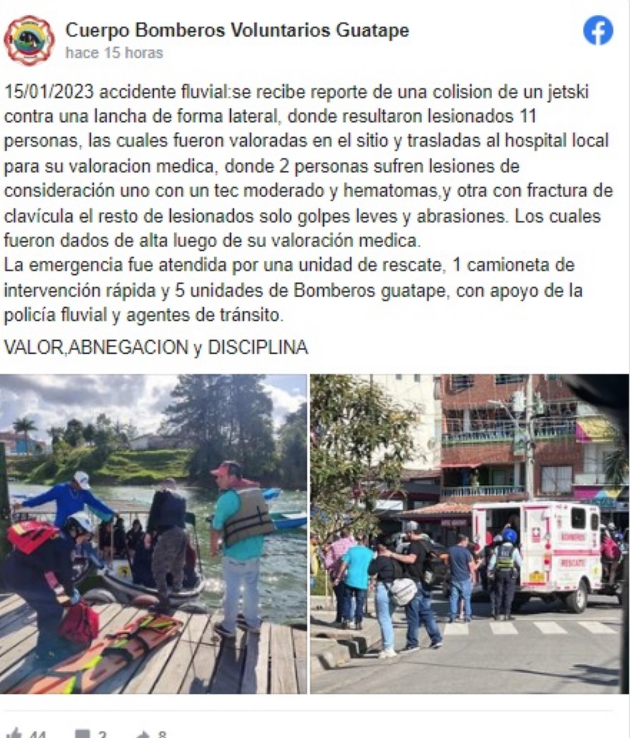 En la tarde del domingo (15 de enero) una lancha que hacía un recorrido por el embalse de Guatapé tuvo una emergencia tras el choque de la embarcación con una moto náutica.