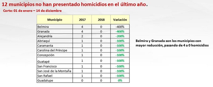 El informe puntualiza que 50 municipios han presentado reducción de homicidios en el 2018 con respecto al 2017: Se destacan los municipios de Puerto Berrio, Briceño, El Peñol, Arboletes, San Vicente, Amagá, Ebejíco, Santafé de Antioquia, Cañasgordas y Entrerrios, siendo Puerto Berrio el municipio con mayor reducción con respecto al 2017, 20 casos menos, seguido del Peñol con 10 casos menos.