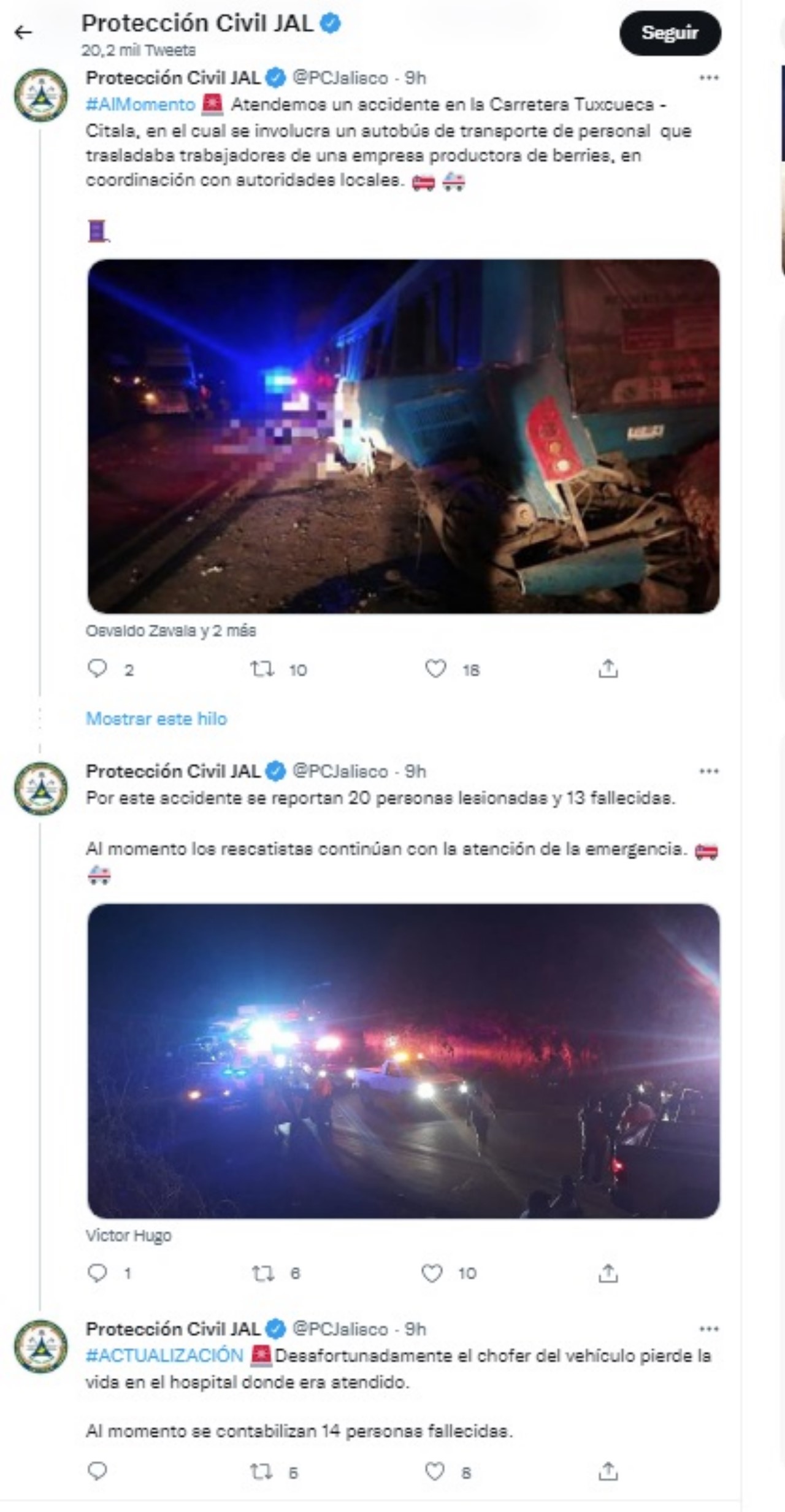 Un comunicado de Protección Civil estatal difundido en sus redes sociales detalló que el vehículo trasportaba a trabajadores de una empresa productora de berries (fresas, moras, arándanos) en la región.