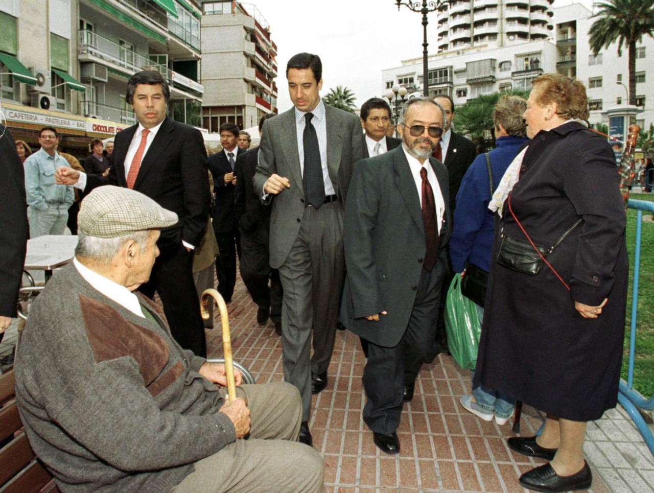 Fotografía de archivo fechada el 21 de febrero de 2000 que muestra al entonces vocero negociador de las FARC, Raúl Reyes (d), y al Comisionado para la Paz del Gobierno colombiano, Víctor G. Ricardo (i), junto al presidente de la Generalitat Valenciana, Eduardo Zaplana (c), durante un recorrido por las calles de Benidorm (España). EFE/MORELL /ARCHIVO