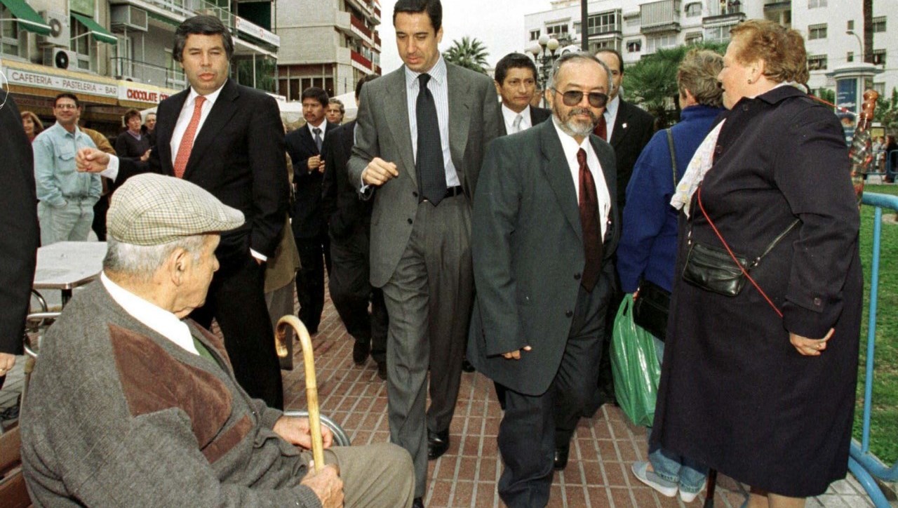 Fotografía de archivo fechada el 21 de febrero de 2000 que muestra al entonces vocero negociador de las FARC, Raúl Reyes (d), y al Comisionado para la Paz del Gobierno colombiano, Víctor G. Ricardo (i), junto al presidente de la Generalitat Valenciana, Eduardo Zaplana (c), durante un recorrido por las calles de Benidorm (España). EFE/MORELL /ARCHIVO