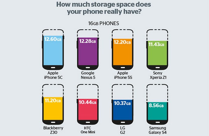 la cantidad de almacenamiento interno que ofrecen los smartphones dentro de sus especificaciones no siempre corresponden con la realidad del almacenamiento libre que queda, ya que, sumado a las aplicaciones precargadas, también se tiene que tener en cuenta lo que pesa el propio sistema operativo, y así, en un smartphone que supuestamente tiene 16 GB, los usuarios solo pueden sacar provecho de una parte.