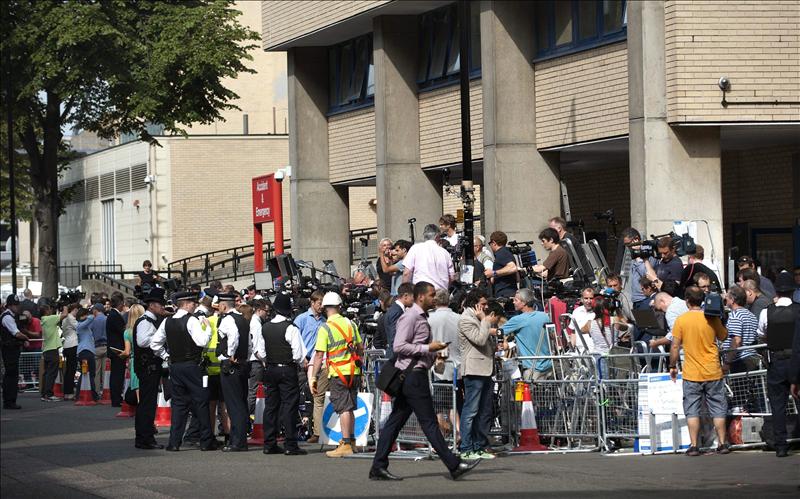 Policías y numerosos medios de comunicación aguardan en el exterior del hospital St.Mary’s de Londres, donde la duquesa Catalina de Cambridge ha sido hospitalizada para dar a luz.