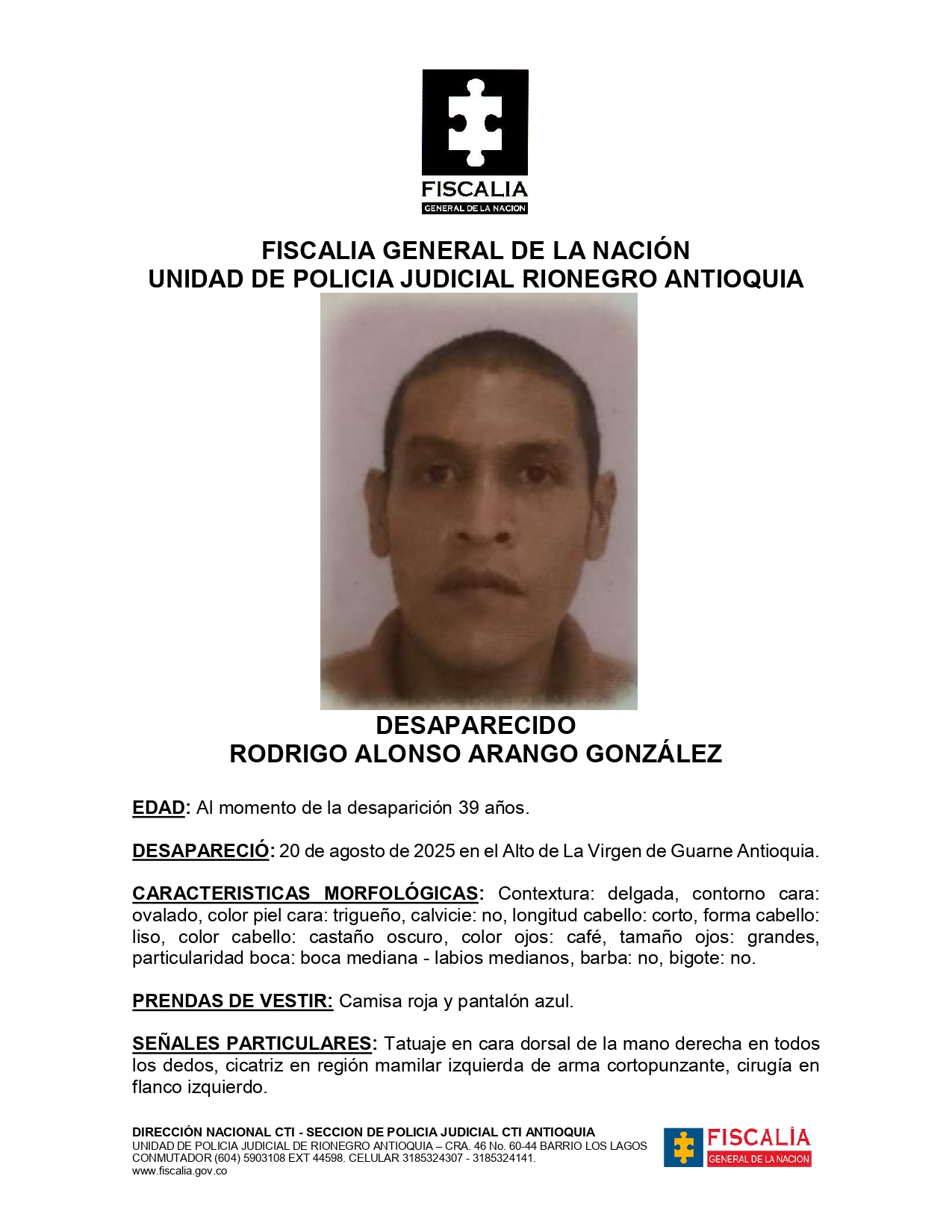 Minuto30.com .- Se solicita la colaboración de la ciudadanía para dar con el paradero de Rodrigo Alonso Arango González, un hombre de 39 años que se encuentra desaparecido desde el pasado 20 de agosto. Fue visto por última vez en el Alto de La Virgen, en Guarne, Antioquia.