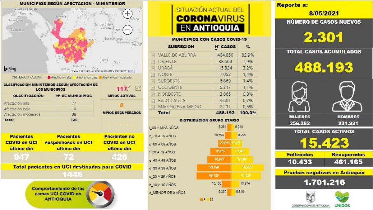 La Secretaria Seccional de Salud de Antioquia, en un nuevo informe sobre el comportamiento del Covid-19 en el departamento, indicó que este sábado 8 de mayo, se reportaron 2.301 contagiados, por lo que la cifra asciende a 488.193.