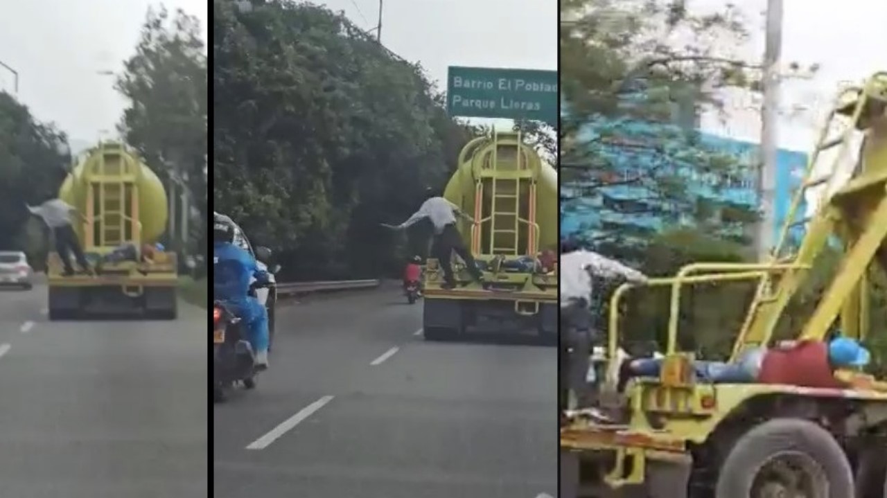A través de las redes sociales de Minuto30 han reportado que dos sujetos viajaban ‘trepados’ de un camión por la autopista Sur, el video fue grabado entre la estación Industriales y Poblado, en Medellín.