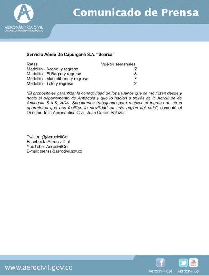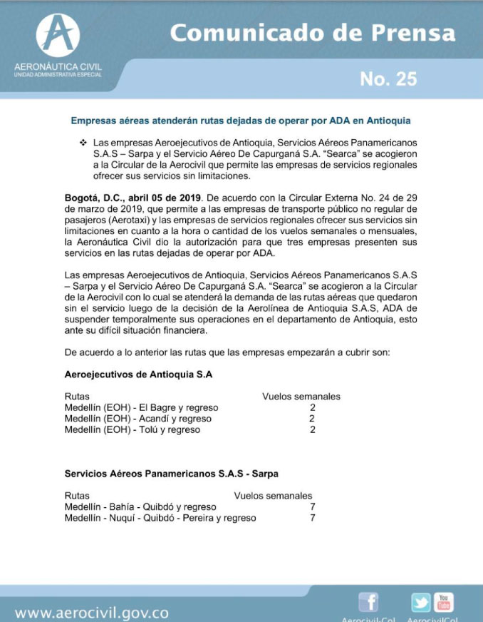 Las empresas: Aeroejecutivos de Antioquia, Servicios Aéreos Panamericanos S.A.S. – Sarpa- y el Servicio Aéreo de Capurganá S.A. -Searca- operarán en las rutas aéreas que quedaron sin servicio luego de que ADA tomará la decisión de suspender sus operaciones en Antioquia a causa de su difícil situación financiera.