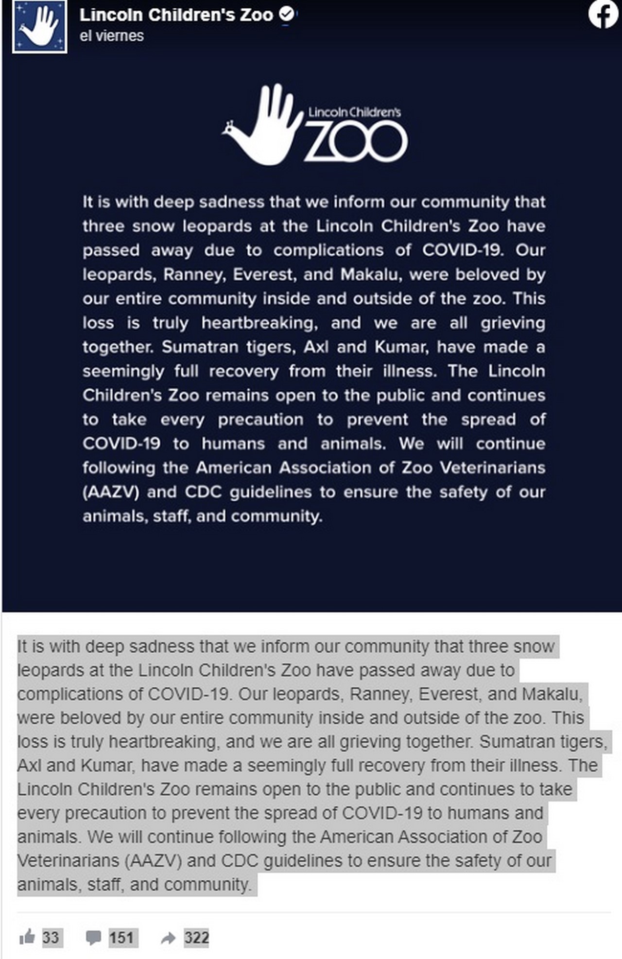 “Nuestros leopardos, Ranney, Everest y Makalu, eran amados por toda nuestra comunidad dentro y fuera del zoológico. Esta pérdida es realmente desgarradora y todos estamos de duelo juntos ”, se puede leer en la publicación en redes sociales.
