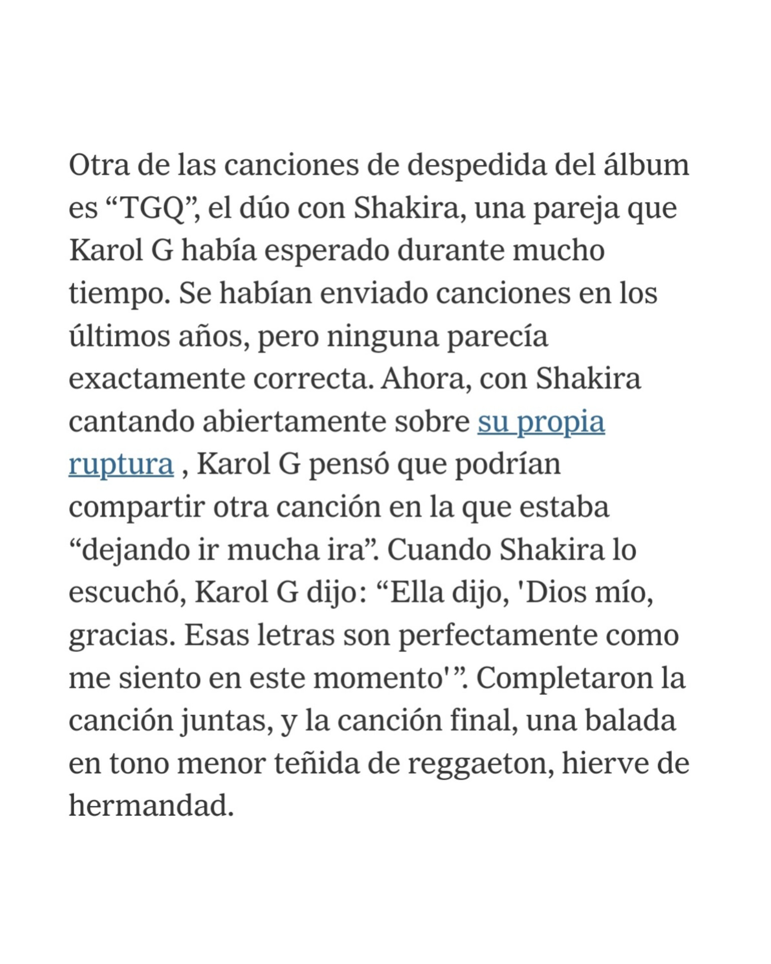 Pues según lo manifestado por Karol, aprovechó la oportunidad por la que estaba pasando Shakira (artísticamente) donde decidió también, sacar provecho de su despecho y le ofreció una letra luego de su éxito con Bizzarap, teniendo como un resultado una canción donde ambas “están dejando ir mucha ira”
