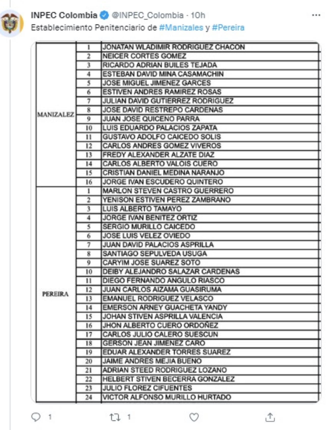 A través de su cuenta de Twitter dieron a conocer el listado de los presos que serán trasladados a Calarcá, Cartago, Ibagué, Pereira, Manizales, Armenia, Jamundí, entre otros municipios.