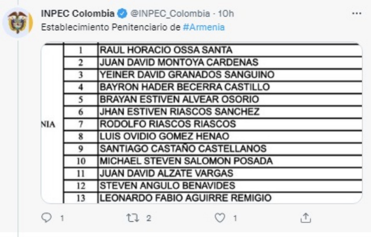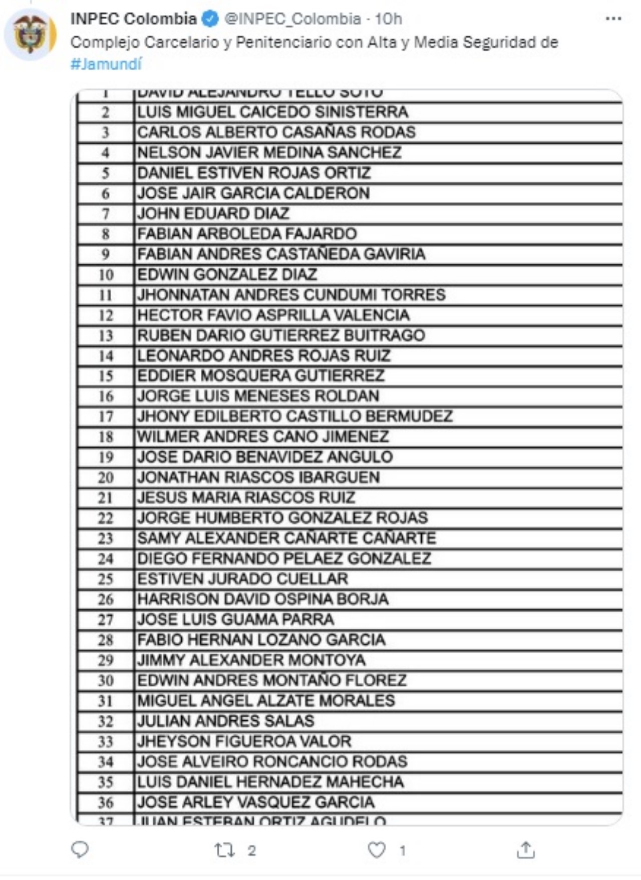 “Nos permitimos informar el listado de los privados de la libertad que serán trasladados a diferentes Establecimientos de Reclusión del país desde la Cárcel y Penitenciaria de Media Seguridad de Tuluá”, se puede leer en el Twitter del INPEC.