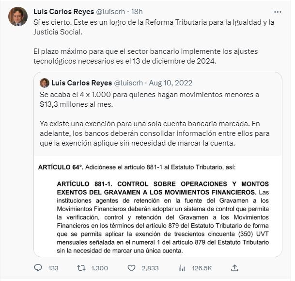 Hace poco el director de la DIAN, Luis Carlos Reyes, compartió en su Twitter que hasta el 13 de diciembre de 2024 tendrán las entidades bancarias, para implementar los ajustes que exentarían del 4×1000 a todas las personas que realicen transacciones menores a los 13 millones en Colombia.