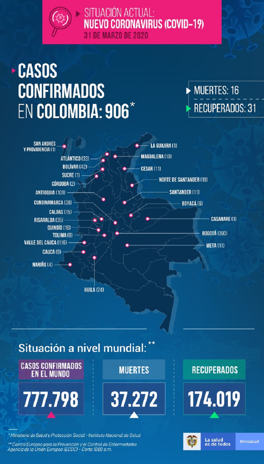 Este martes el reporte del Ministerio de Salud sobre nuevos casos de contagio por coronavirus en Colombia elevó la cifra total en el país a 906 casos.