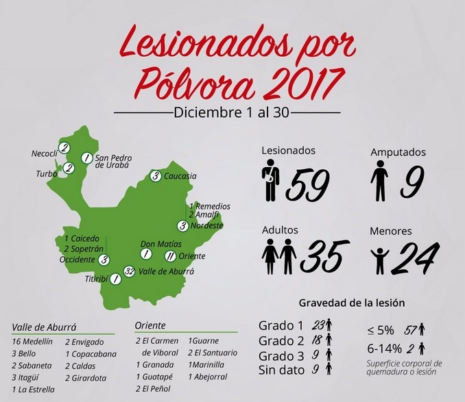 Según el reporte de la Secretaría Seccional de Salud y Protección Social de Antioquia, entre el 1 y el 30 de diciembre, 59 personas resultaron lesionadas por pólvora.