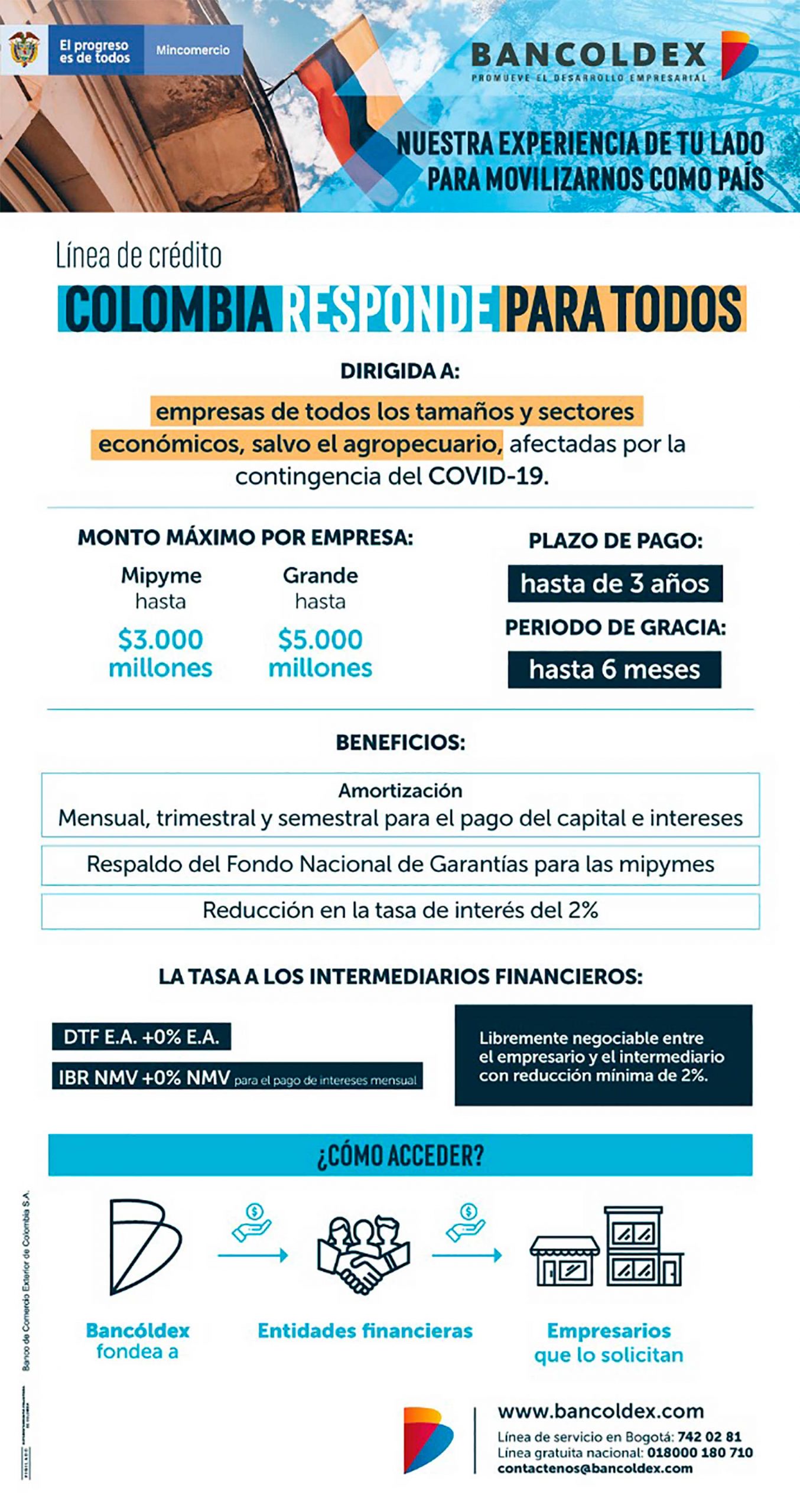Estos créditos, de alcance nacional, hacen parte de un paquete de acciones dispuesto por Bancóldex para solventar los efectos del COVID-19 a través de otros mecanismos como: