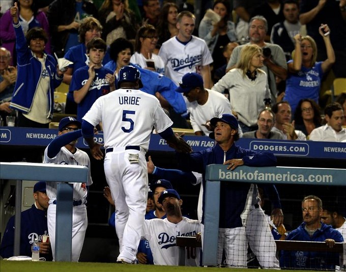 El antesalista dominicano Juan Uribe y el primera base mexicano Adrián González pegaron sendos jonrones para los Dodgers de Los Ángeles, que vencieron 9-3 a los Diamondbacks de Arizona y que redujeron a dos su número mágico para conseguir el título divisional.