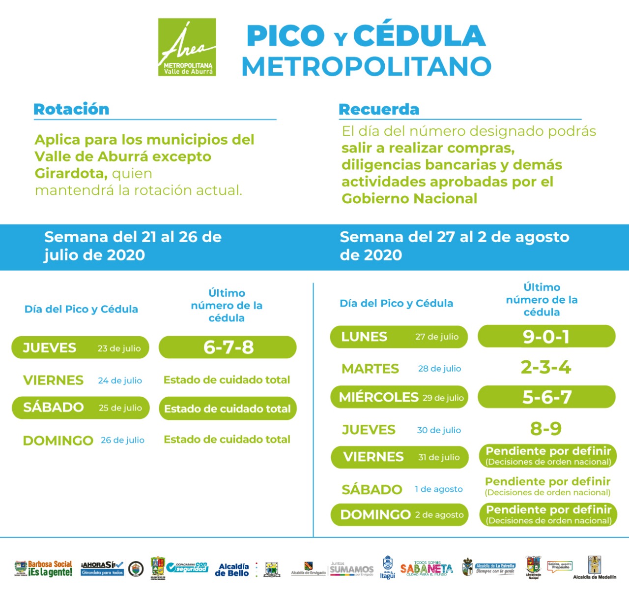 Luego de que el alcalde de Medellín, Daniel Quintero, indicara que en el Valle de Aburrá sí se llevará a cabo la cuarentena el fin de semana, menos en Girardota, el Área Metropolitana definió cómo quedará el pico y cédula en los municipios. En principio se tenía que este viernes podrían salir algunos números, sin […]