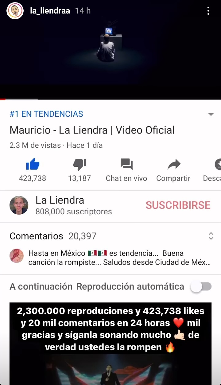 El sábado 29 de agosto, La Liendra festejó por lo alto e invitó a un grupo de amigos cercanos al debut del video en el Hotel 4Fun de Medellín, citados a las 7:00 pm con la presencia de otros influencers como “La Segura“, Djs, Periodistas y equipo de trabajo. Allí “Mauricio” fue aplaudido por los asistentes quienes vivieron una fiesta especial con fotos, cócteles y música. Mientras esto sucedía, las redes respondieron con las “Liendritas” como cariñosamente él llama a sus seguidores, que hicieron la tarea de likes y visualizaciones convirtiéndolo en tendencia nacional y más. Fue el video más visto durante 24 horas, sumando más de 2.3 millones de reproducciones y más de 400 mil likes siendo sensación en México, Ecuador y Perú entre otras latitudes.
