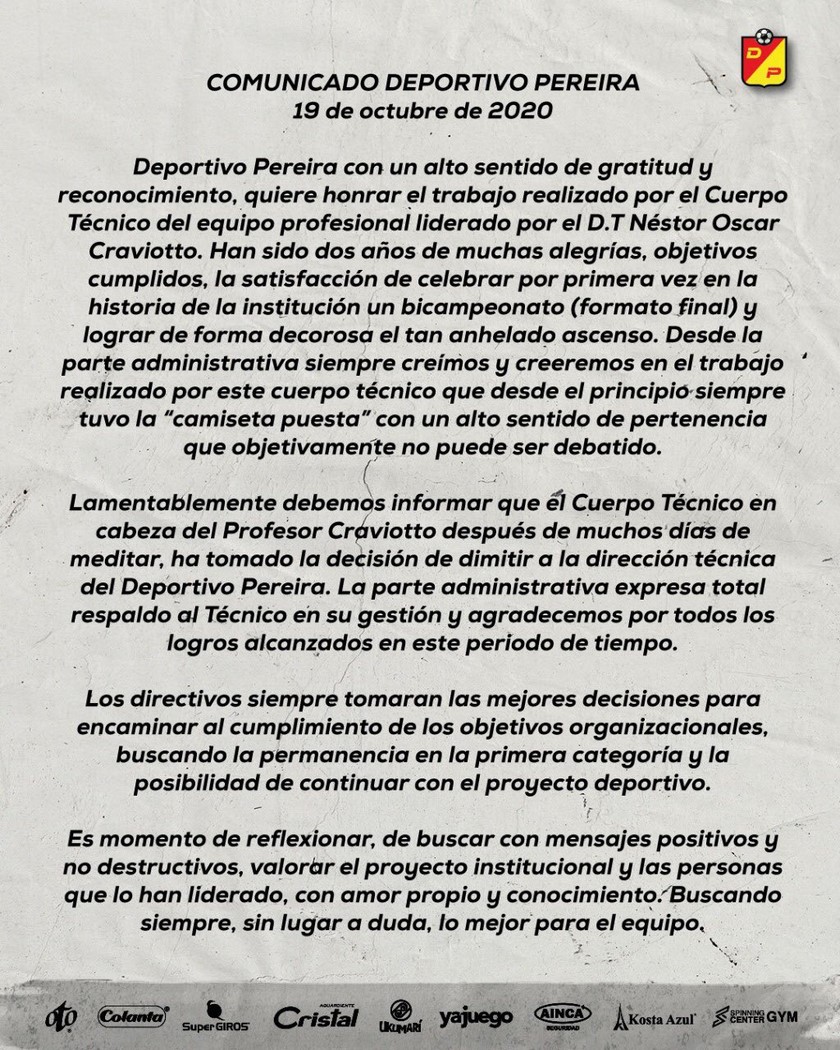 Minuto30.com-  A través de un emotivo mensaje de gratitud, Deportivo Pereira anunció este lunes en la tarde la salida de Néstor Craviotto de la dirección técnica del equipo.