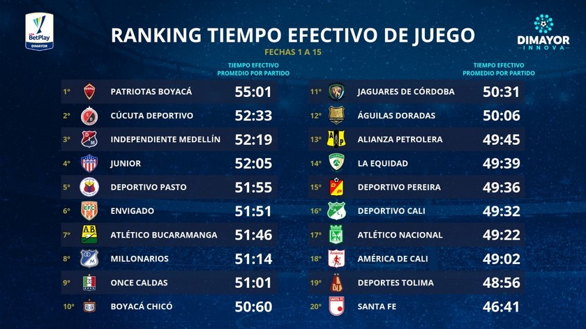 De hecho, Patriotas Boyacá, que es último en la Liga I, con solo 7 puntos; y Cúcuta Deportes, que es el antepenúltimo, con 14 puntos, son los equipos con mayor tiempo efecto de juego, corridas quince fechas.