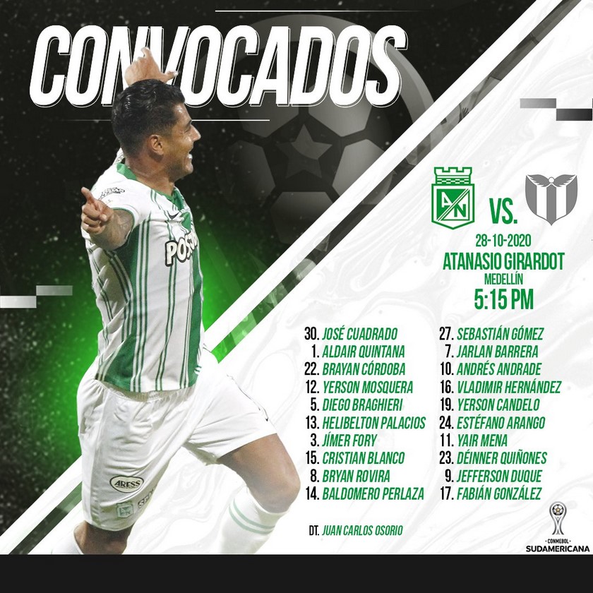 Minuto30.com- Salvo las bajas que tendrá por lesión, Atlético Nacional convocó sus principales fichas para el partido de ida de la segunda fase de la Copa Sudamericana, frente a River Plate, de Uruguay.