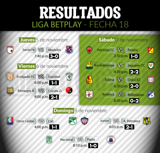 Por su parte, Rionegro Águilas Doradas y Millonarios, que están por fuera de los ocho y buscan afanosamente una plaza en este grupo, lograron importantes triunfos en esta jornada, aunque por ahora su esfuerzo es infructuoso, pues salvo La Equidad, que empató con Envigado FC, los últimos clasificados también ganaron en la decimoctava fecha.