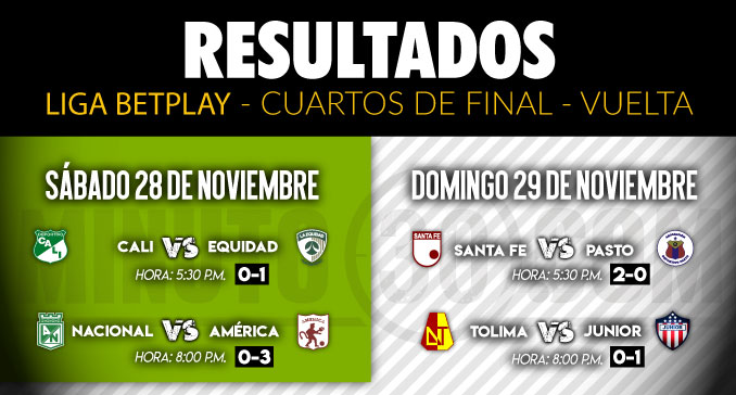 Así pues, en la semifinal se medirán Independiente Santa Fe y La Equidad, en la llave 1; y América de Cali y Atlético Junior, en la llave 2.