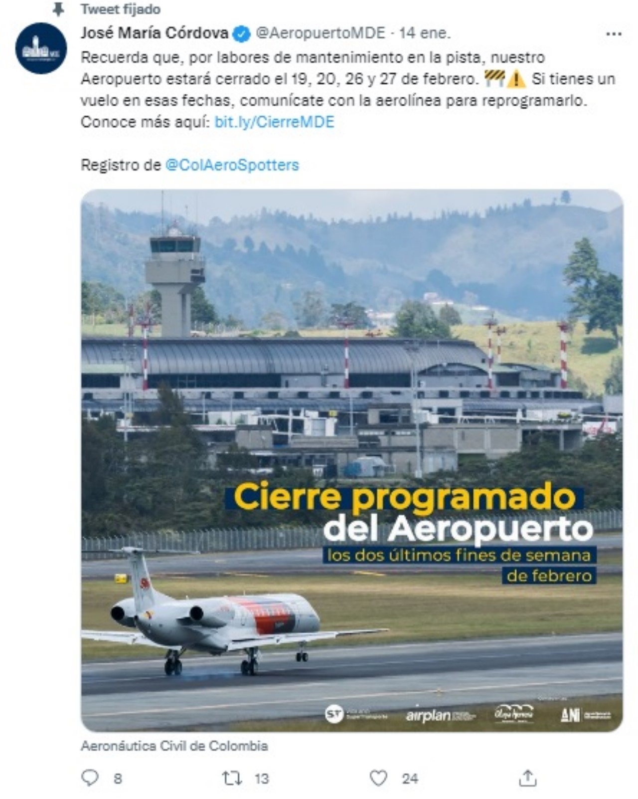 El Aeropuerto Internacional José María Córdova fue autorizado por la Aeronáutica Civil de Colombia para cerrar su pista, por motivo de mantenimiento, los dos últimos fines de semana de febrero, desde las 2 a. m. de cada sábado hasta las 2 p. m. de cada domingo, sumando un total de 72 horas de trabajo para intervenir el pavimento.