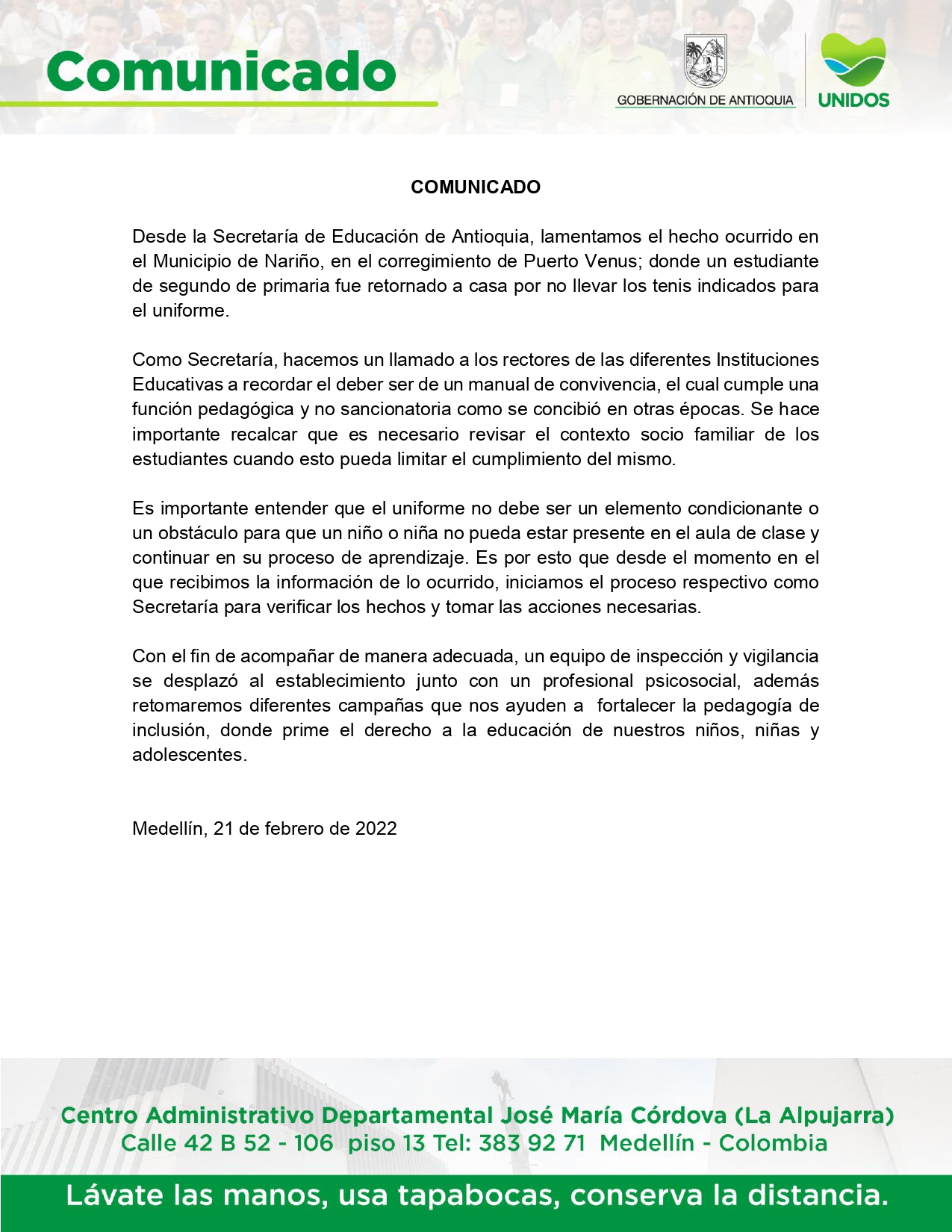 El pasado 17 de febrero un niño de una escuela rural del corregimiento de Puerto Venus, en municipio antioqueño de Nariño, fue devuelto por no llevar tenis negros como lo indicaba el uniforme de ese día. La Secretaría de Educación de Antioquia se pronunció sobre el caso.