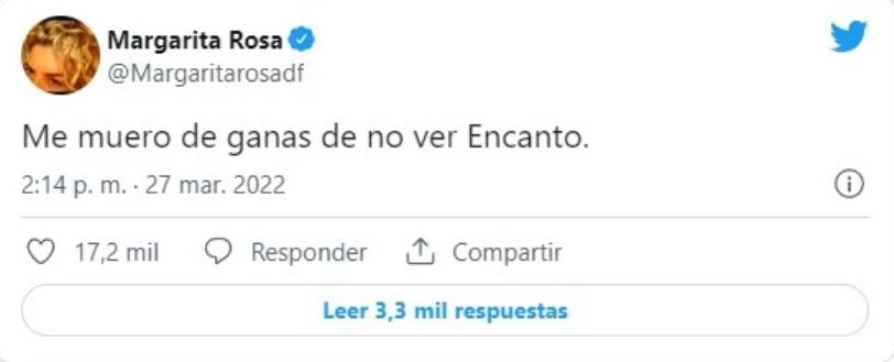 La actriz Margarita Rosa de Francisco había dicho a través de sus redes sociales su opinión sobre la película encanto pero luego que ganó el premio a Mejor Pelicula Animada los Oscars, le tocó borrar su tweet y cambiar de pensamiento.