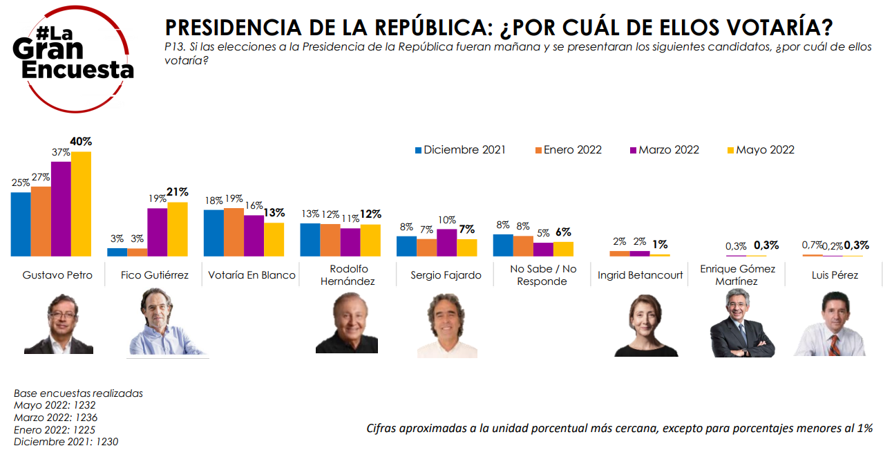 Este miércoles, 11 de mayo, salió a la luz una nueva encuesta presidencial, donde los colombianos demostraron que nuevamente el candidato Gustavo Petro continúa afianzado en el primer lugar, con una amplia distancia con relación al segundo lugar, y con varios ítem a analizar.