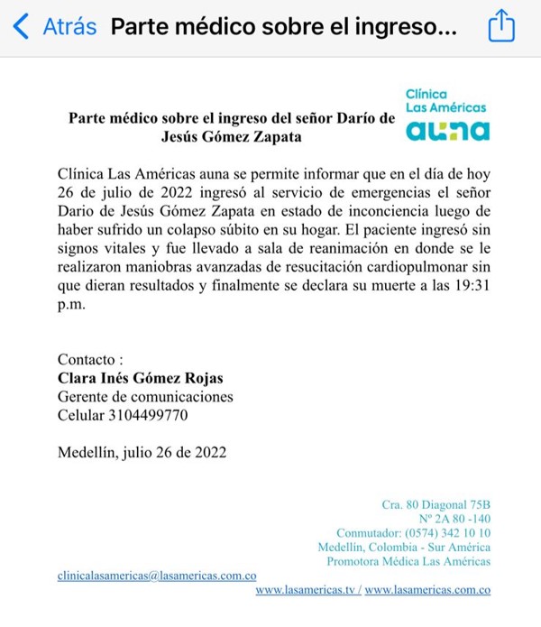 Según Parte Médico expedido por la Clínica Las Américas, Darío Gómez habría sufrido un colapso súbito en su hogar por lo que fue llevado hasta urgencias de la Institución Médica.