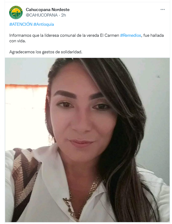 The Humanitarian Action Corporation for Coexistence and Peace in Northeast Antioquia (@CAHUCOPANA) reports that social leaders Lenin Guerra and Yuliana Galeano were kidnapped by armed men. Lenin was killed, Yuliana has been found alive. https://t.co/UWILB04Llc #PBIaccompanies pic.twitter.com/ZEFVflBvuD