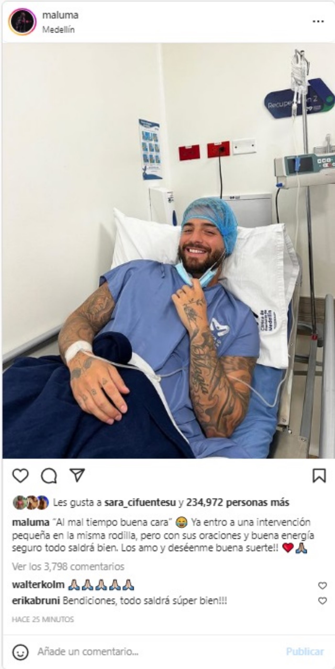 “‘Al mal tiempo buena cara’ Ya entro a una intervención pequeña en la misma rodilla, pero con sus oraciones y buena energía seguro todo saldrá bien. Los amo y deséenme buena suerte”, escribió el cantante en última publicación.