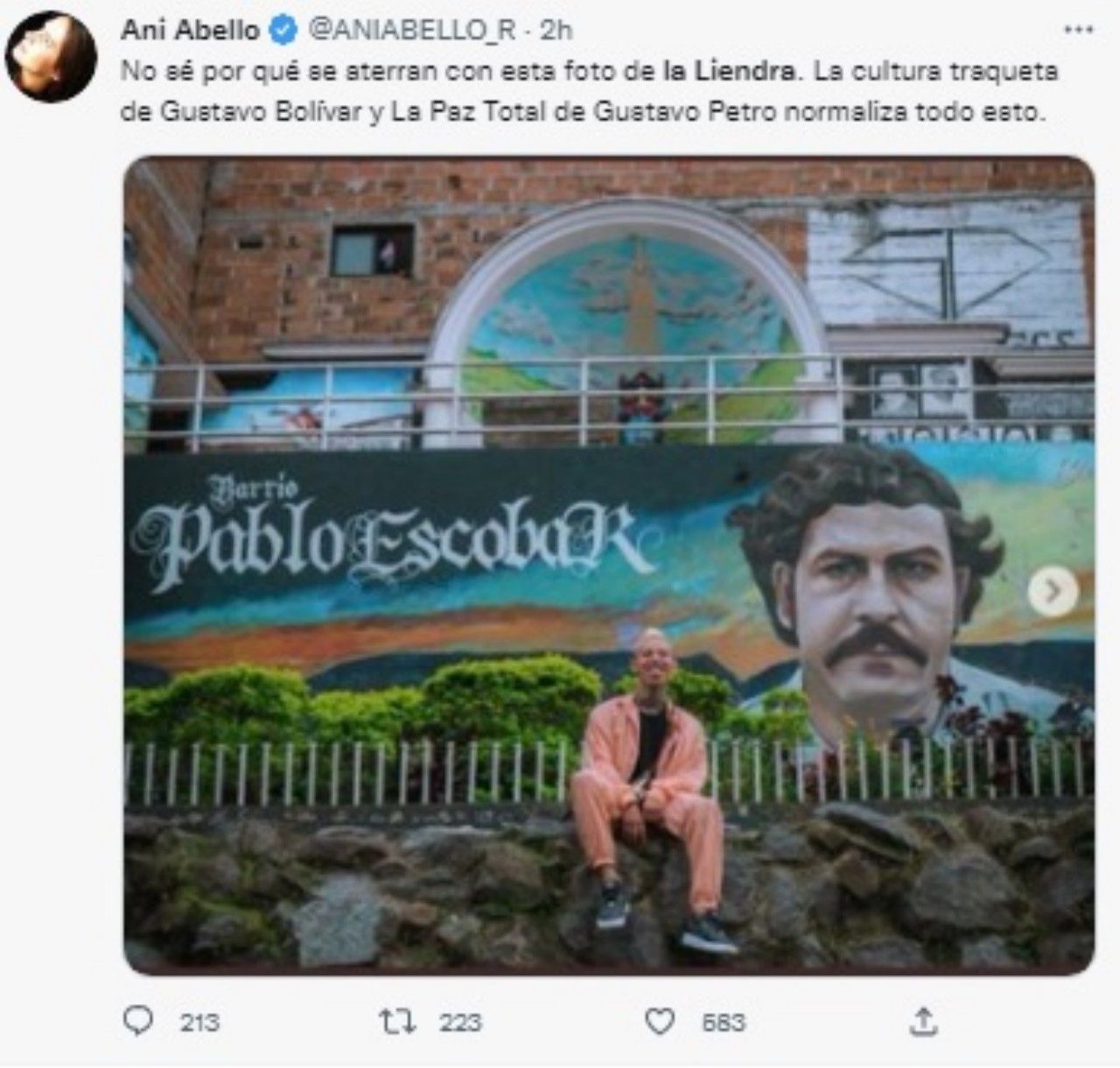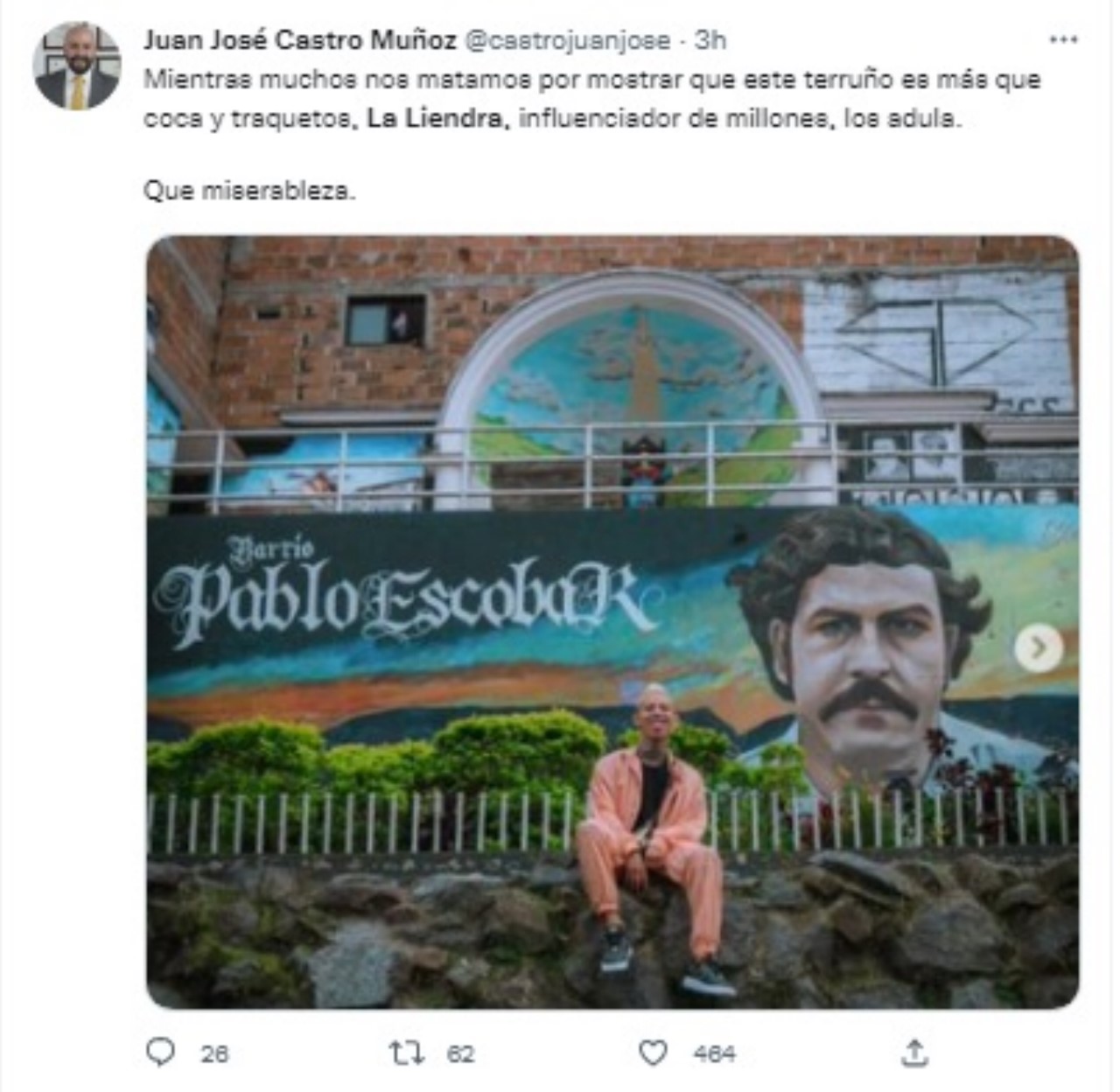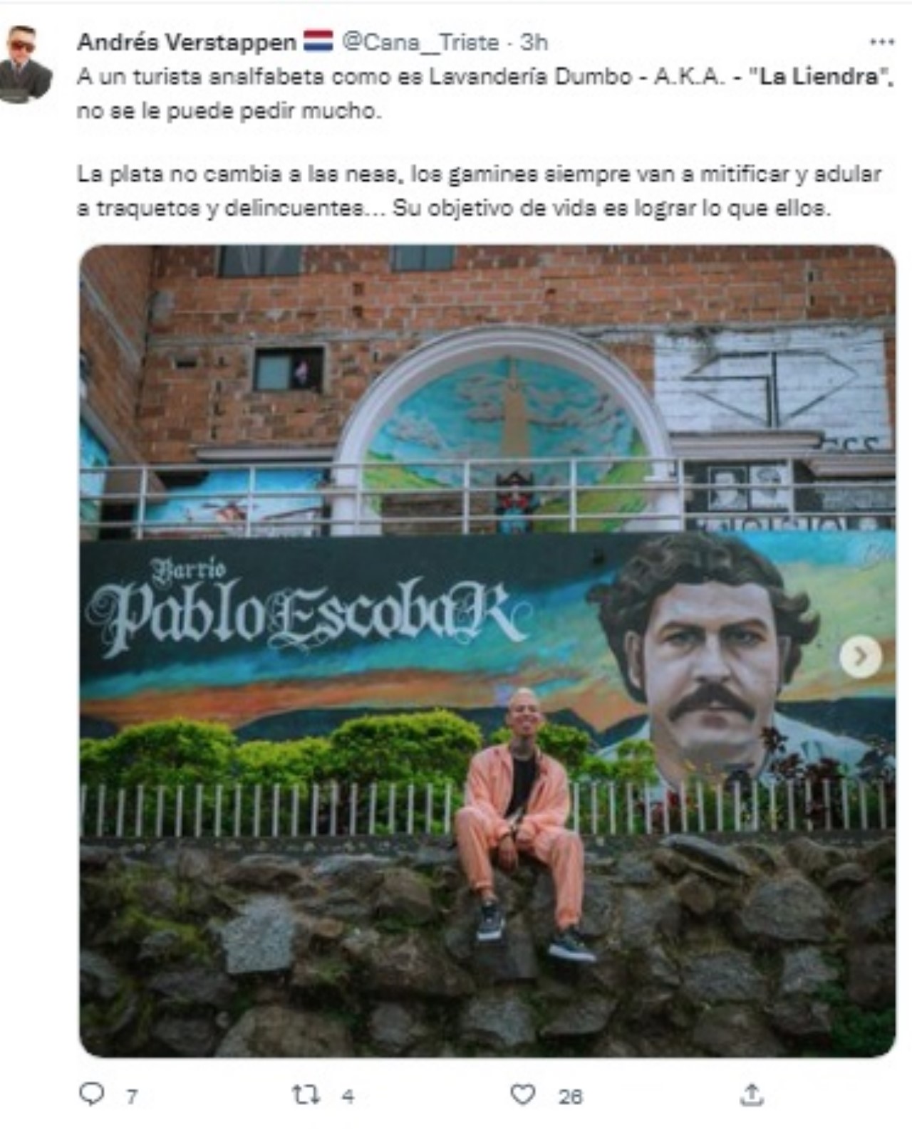 Aunque él publicó varias fotografía del barrio, la que llamó la atención de los internautas es donde La Liendra sale sentado en un mural donde sale el rostro de Pablo Escobar.